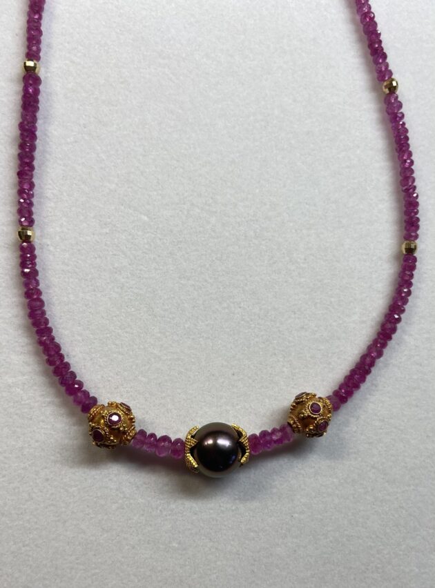 18K DESIGNER RUBY BEAD NECKLACE WITH TWO 22K GOLD BEADS AND TAHITIAN SOUTH SEAS BLACK PEARL.