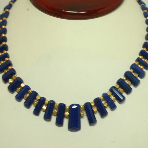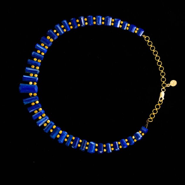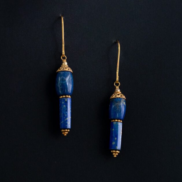 Genuine lapis and 18k gold beads create a vibrant setting for this eye-catching gold and lapis statement necklace and earrings set. Every Jewel of the Lotus piece is hand-made and one-of-a-kind.