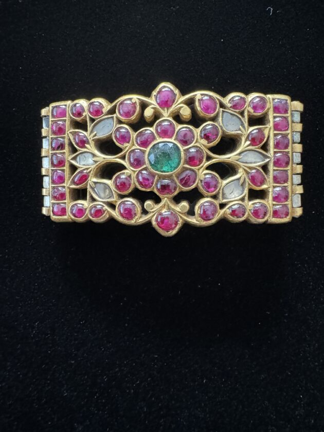 SKU 1087 ATQ 22K Gold Kunden set Gemstone Belt Buckle, Emerald, Diamonds and Rubies on silver backing.