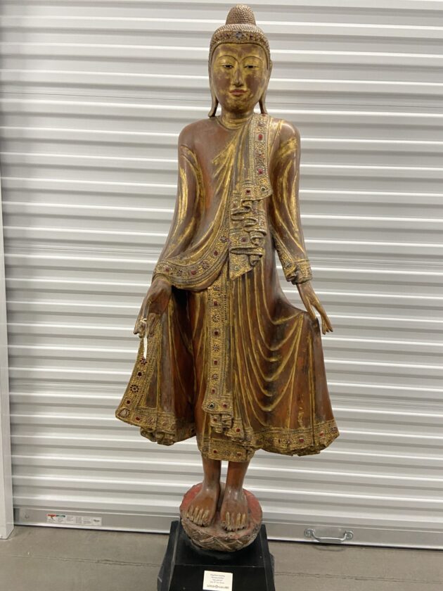 This antique Burmese Mandalay wooden standing 5′ 6″ life size Buddha is a true Collector’s Treasure. The bonevilant expression on this Buddha’s face of compassion represents all that one finds in Buddhism.