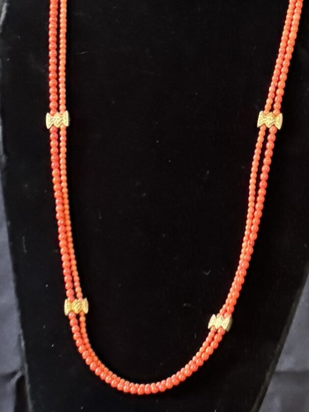 SKU 9218, 18K Gold conponents, Multi strand Red Mediterranean Coral Necklace , 12″ Long , 418 Beads, strung and designed by Tsajon