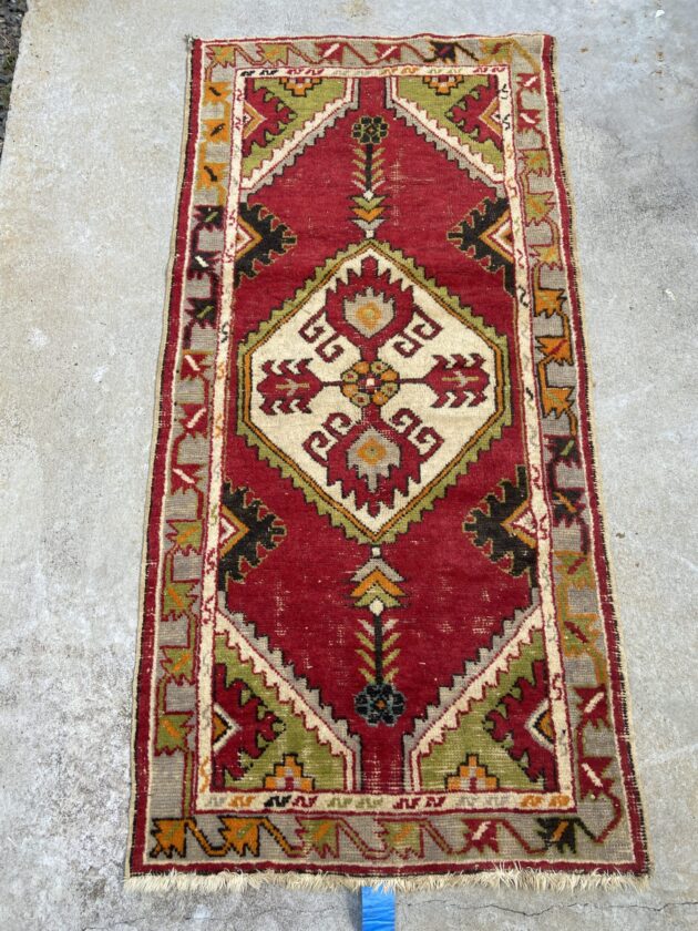 SKU 4569. Original Turkish Kazak Tribal Carpet, 32″X 66″ , Red/Celedon $500-Dimension 32″ x 66″